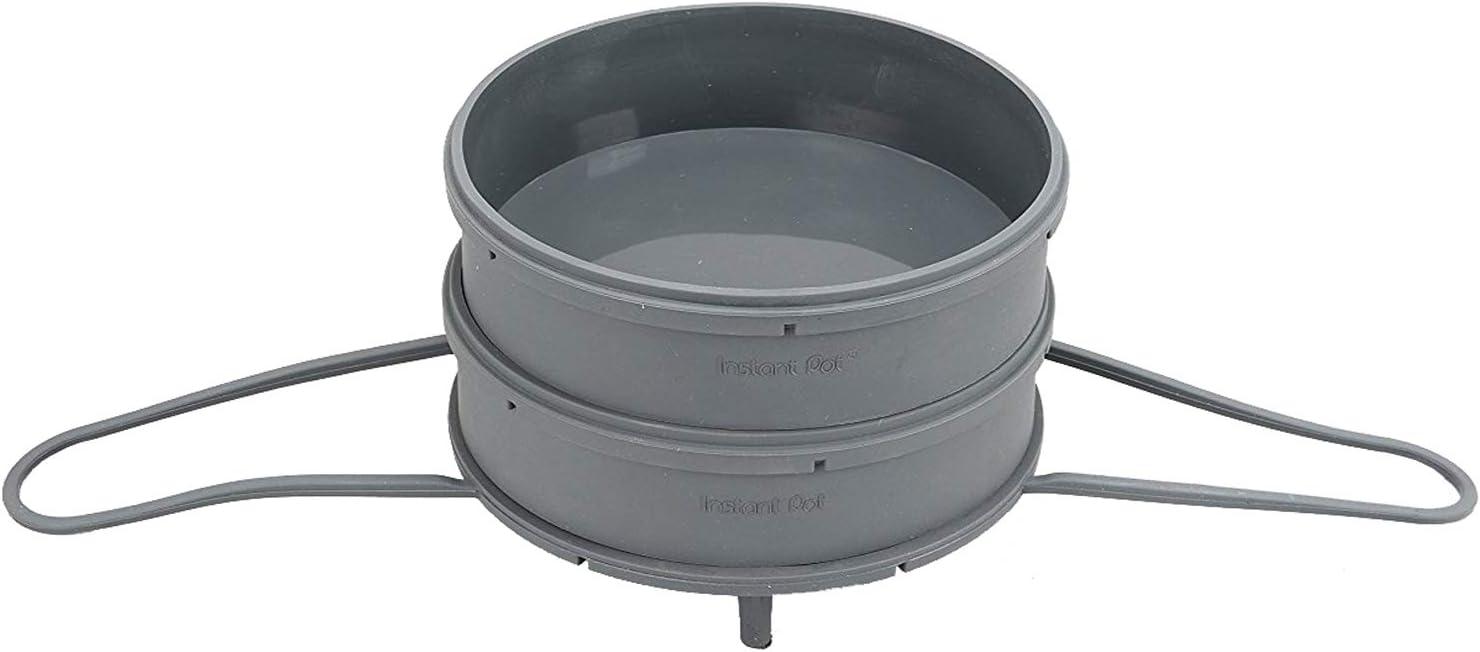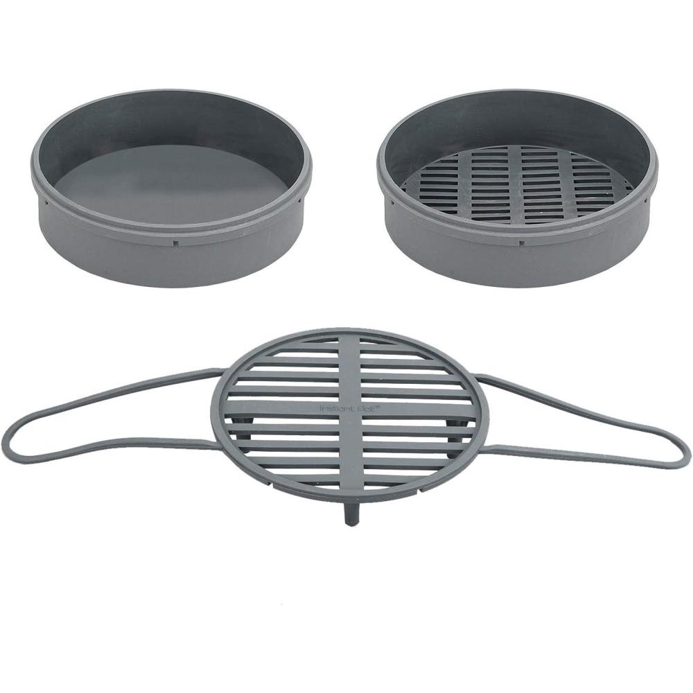 Instant Pot silicone steamer set will maximize your space in your Instant Pot electric pressure cooker. The set includes a sturdy silicone steam rack with long legs to keep it out of the water when steaming. The steam rack has long handles to enable safe and easy removal of the accessories fitted onto its molded rim. A silicone steamer basket designed to fit on the steam rack and can be stacked two high in the Instant Pot 6 and 8 Quart. Silicone broiler pan with a gloss finish for non-stick easy cleaning stacks securely on the steam rack or the steamer basket.