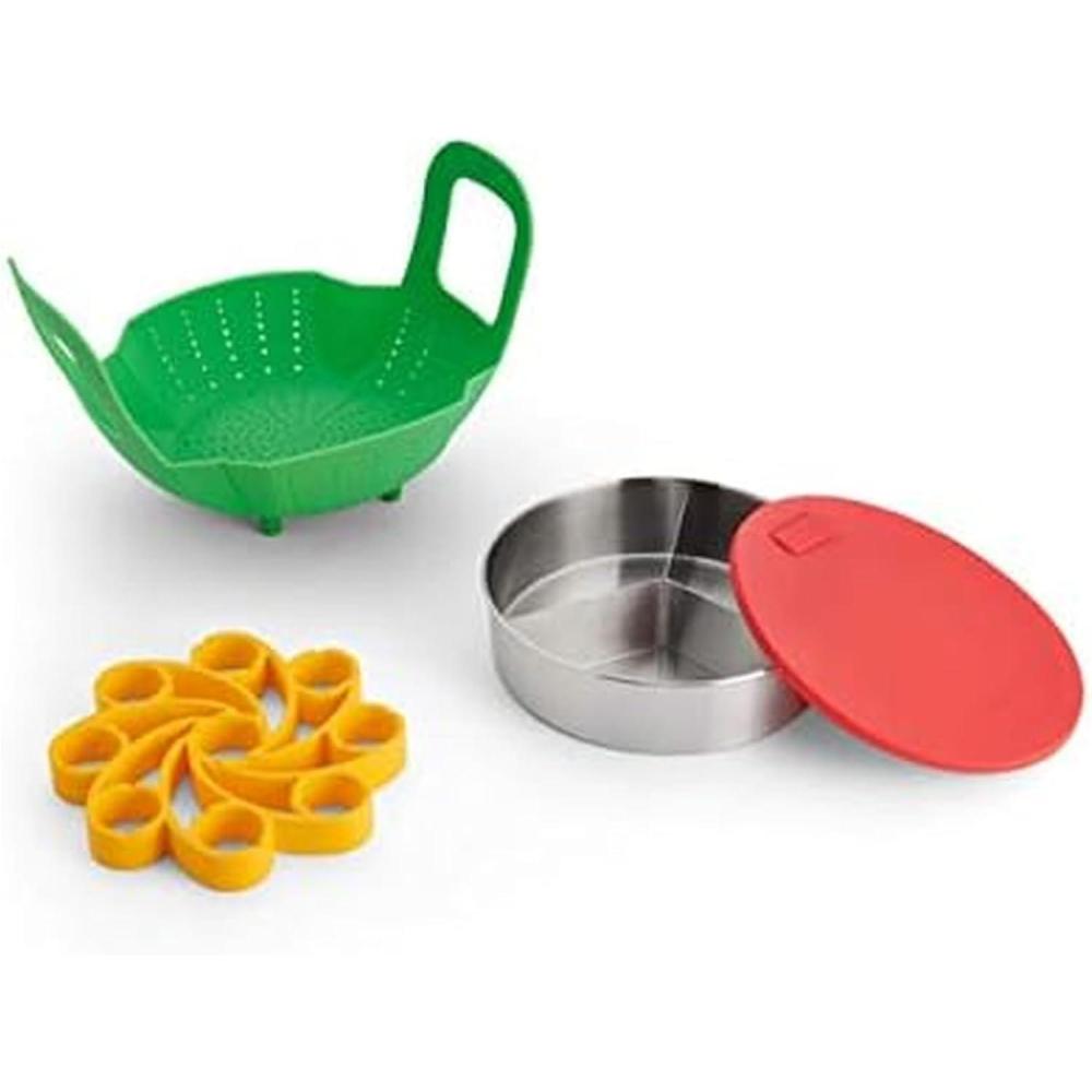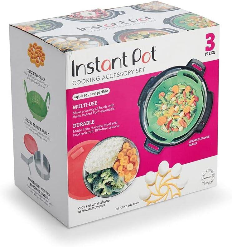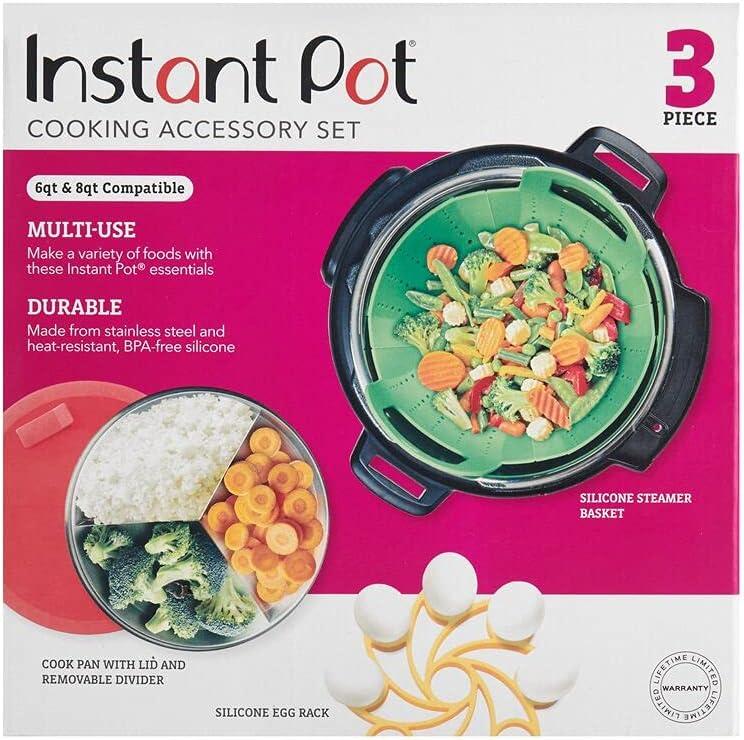 This essential Instant Pot Official 3-Piece Cooking Set is specially designed for use in Instant Pot pressure cookers. Cook & bake foods to perfection in the Round Pan, and use to store and reheat as the pan is freezer to Instant Pot compatible. Cook several foods at once using the stainless steel removable divider. The snap-fit silicone lid features a pressure-release tab for releasing steam. The Silicone Steamer Basket features secure-lock handles that neatly tuck under the lid of your Instant Pot while cooking, and provide safe, effortless removal of food after cooking. The handles also snap into the feet after use and cleaning for easy storage. Make 9 hard- or soft-boiled eggs using one Silicone Egg Rack and 18 when you stack two. Not only do the eggs come out just as desired, they are also easy to peel. Place rack in Instant Pot, then add eggs. You can also use the rack as a trivet to cool or decorate eggs. The pieces are made from stainless steel and BPA-free silicone, heat resistant up to 450° F (232° C). Handwashing is recommended. Compatible with 6-quart and 8-quart cookers; the Egg Rack is also compatible with 3-quart cookers.