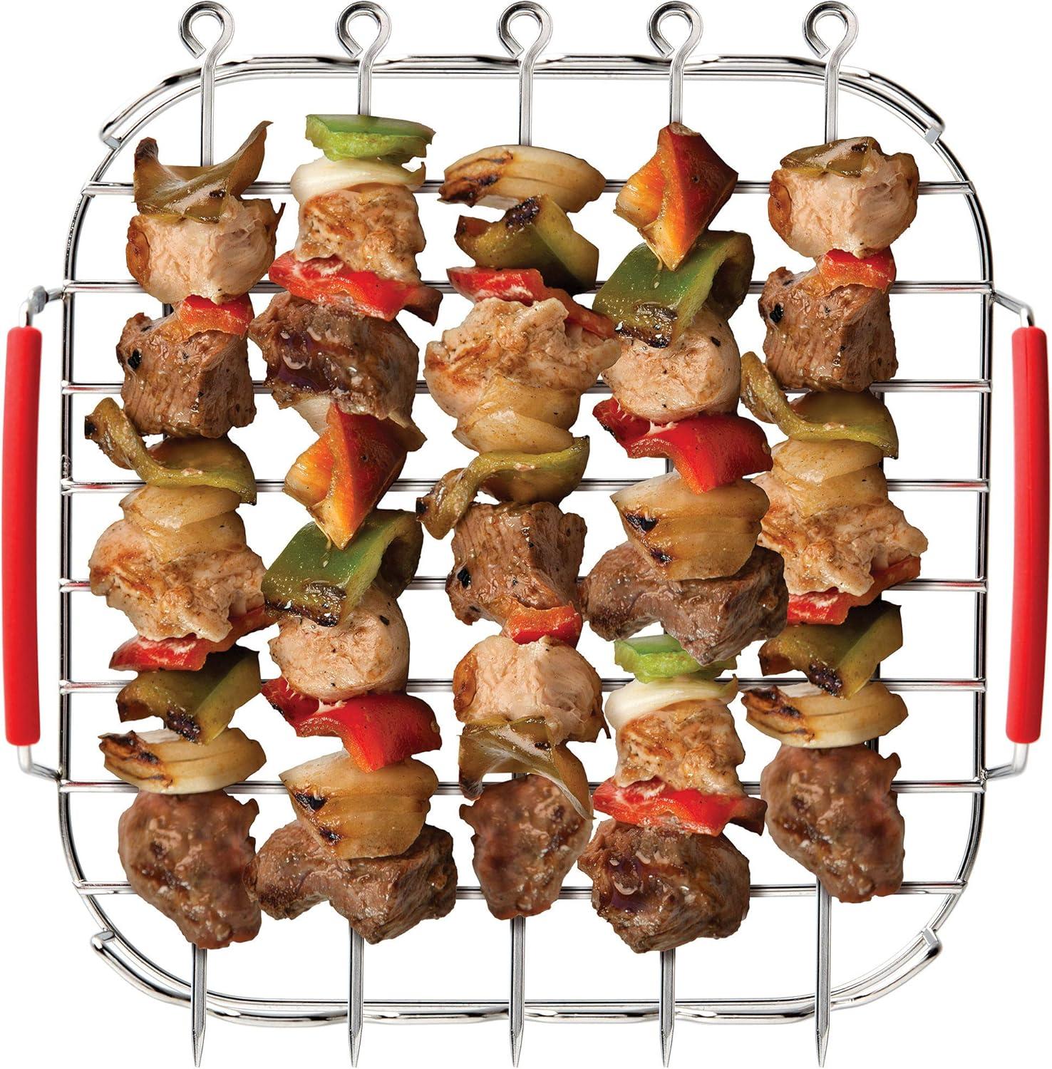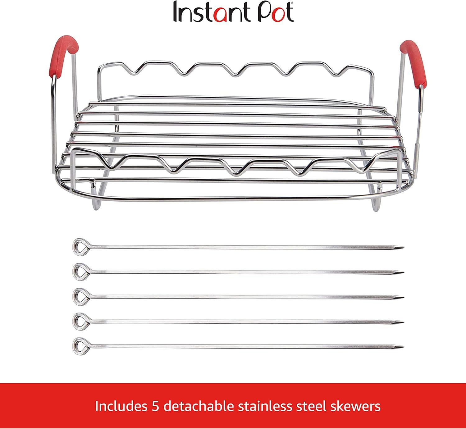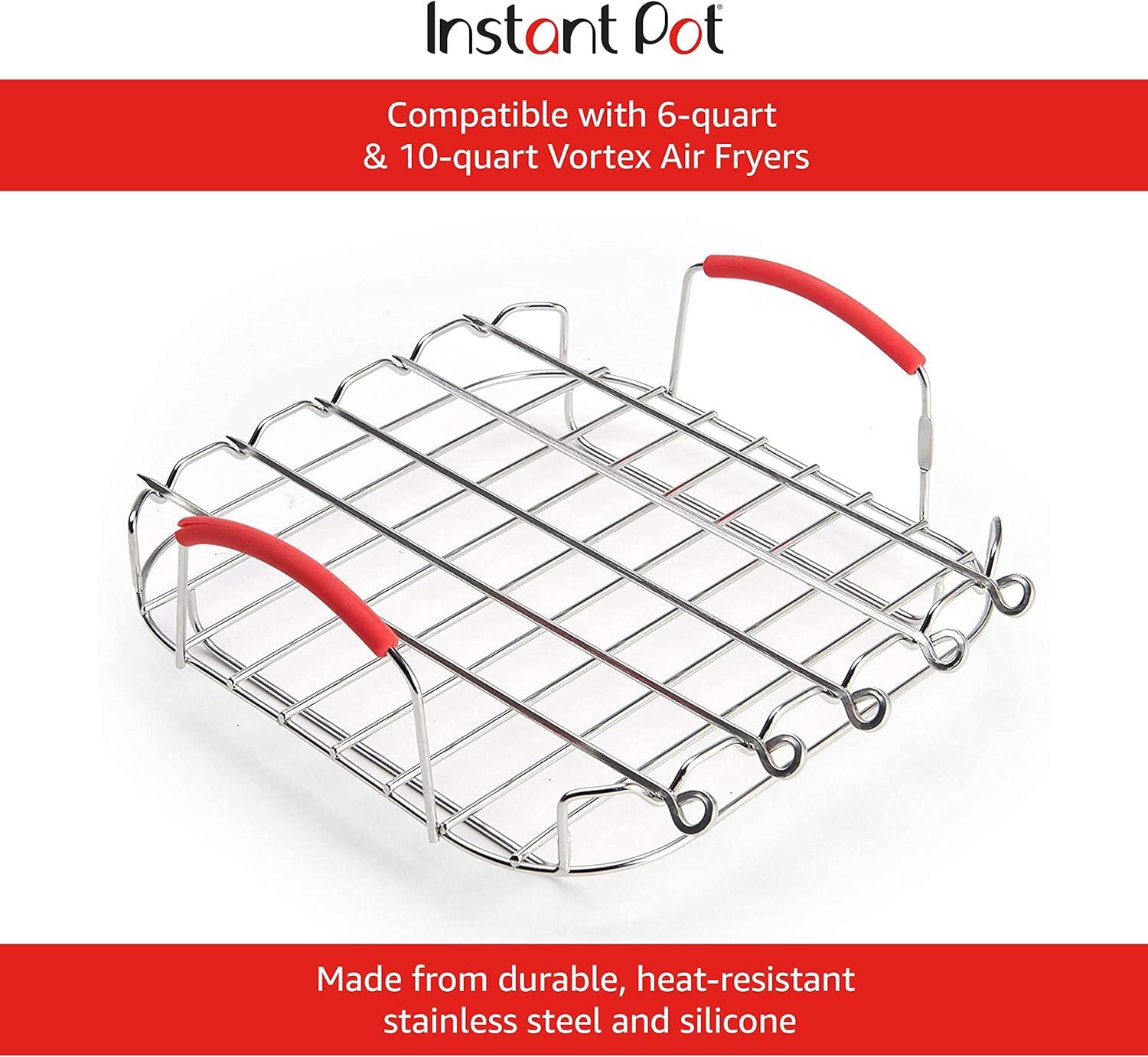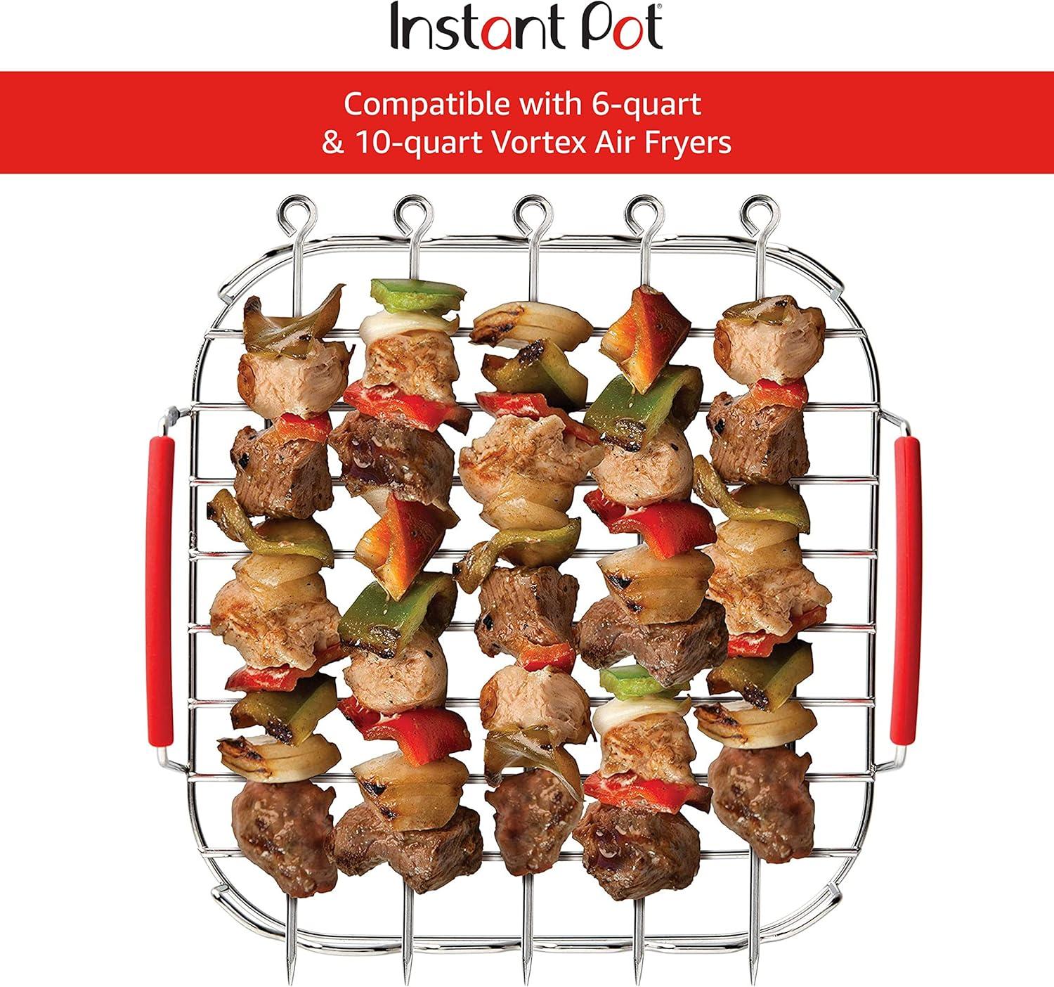 Enhance your cooking experience with the Instant Vortex Official Grill and Lifting Rack with Skewers. This 6-piece set is an essential accessory for your Vortex Air Fryer, designed to elevate your food while cooking, maximizing airflow for even results. Whether you’re grilling, roasting, baking, or cooling, this rack ensures your food is cooked to perfection. The multi-use functionality of this rack allows it to securely hold pans in place in your fryer, providing stability and convenience for various cooking methods. The set includes 5 stainless steel skewers, perfect for making kebabs, grilling vegetables, or even roasting marshmallows. These skewers are durable, easy to clean, and add versatility to your cooking repertoire. Constructed from high-quality stainless steel and silicone, this rack is heat resistant up to 450°F, ensuring it can withstand high temperatures and provide safe, effective cooking every time. The durable materials ensure longevity, making this rack a reliable addition to your kitchen tools. Designed to be compatible with 6-quart and 10-quart Vortex Air Fryers, this rack sits perfectly on the provided baking tray, enhancing the functionality of your air fryer. Measuring 9.5 x 9 x 3.25 inches, it’s the perfect fit for your air fryer needs. Hand wash is recommended to maintain its quality and durability. Upgrade your air frying experience with the Instant Vortex Official Grill and Lifting Rack with Skewers, and enjoy healthy, evenly cooked meals with ease. This versatile, durable, and essential accessory will quickly become a staple in your kitchen.